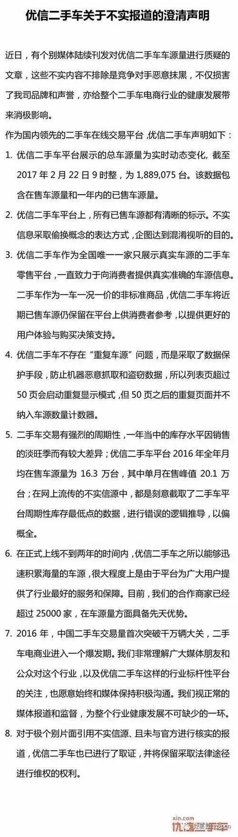 其二,在声明中,优信摆出了对待公众的真诚态度,“我们非常理解广大媒体朋友和公众对这个行业,以及优信二手车这样的行业标杆性平台的关注,也愿意始终和媒体保持积极沟通。”就在刊发声明的同时,优信积极安排高层接受媒体采访,还原真实。
