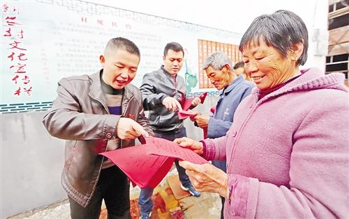 3月10日,江西广昌县头陂镇党员干部将《移风易俗倡议书》、《操办红白喜事“十禁止、十提倡”》宣传单发放到羡地村壕田上组村民手中。苏 平摄