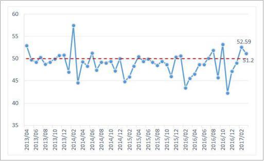 3月份中国企业前景指数为49.89,上月的预测期为3-5月份,本月预测期为4-6月份。2016年3季度以来,企业营收均值的预测连续两个月走高,在2016年12月达到50.11的高点。1月份、2月份和3月份,预测值环比连续三个月回落。