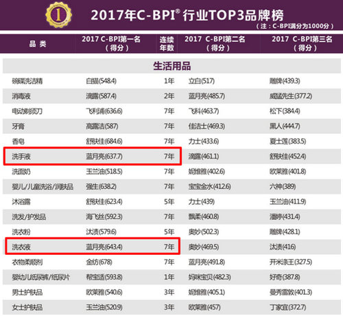 然而在一众外资品牌中,“蓝月亮”作为中国老百姓熟知的洗涤品牌,一举拿下洗衣液与洗手液两个品类第一,据C-BPI方面介绍,在这两个领域中,蓝月亮已经连续7年(2011-2017年)保持行业第一,因而被同时授予“黄金品牌”(注:黄金品牌要求品牌连续5年或以上保持行业第一)荣誉。