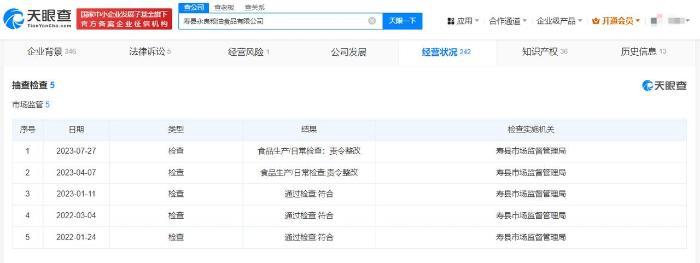 天眼查行政处罚信息显示,2023年4月13日,寿县永良粮油食品有限公司因虚假宣传被淮南市市场监督管理局罚款200万元。处罚事由显示,当事人为了获得市场竞争优势,提高大米销量,将寿县稻谷生产的大米宣称“二代泰国香米”,且以普通大米价格进行销售吸引消费者,使消费者将购买的寿县产大米与泰国产大米混淆,误认为购买的是泰国大米。抽查检查信息显示,寿县市场监督管理局分别在2023年4月、7月对寿县永良粮油食品有限公司进行2次抽查检查,结果均为“责令整改”。
