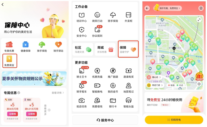 针对较多骑手反映夏季手机耗电大的问题,美团充电宝上线了骑手专享的“免费用宝”活动,骑手点击配送App保障中心的“免费用宝”入口,在指定点位借还充电宝即可享24小时免费租借福利,每位骑手还有每月两次不限归还点位的免费租借权益。