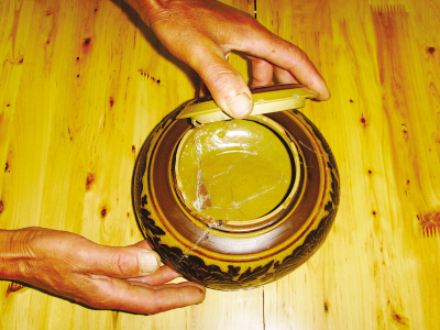 年近六旬的刘远书是大渡口区农民。5年前,刘远书偶然看见邻居用来喂鸡的粮槽,虽然已破碎成几大块,但它的花纹和色泽非常古朴,不像是当代的瓷器,他当即就花了数十元买了回来。回到家,他去掉瓷器表面陈旧的水泥,再用胶水将碎片粘合在一起,形成了一个扁中带鼓的罐子。