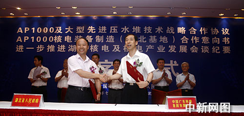 中新网武汉7月31日电 (艾启平 娄云)7月31日下午,中国广东核电集团有限公司(简称中广核集团)与国家核电技术有限公司、中国船舶重工集团公司等中央企业在武汉签署有关AP1000合作协议。同时,湖北省政府与中广核集团也签署有关协议,加快推进湖北核电项目后续建设。中国国家能源局副局长孙勤、中共湖北省委常委、常务副省长李宪生等出席了签字仪式。
