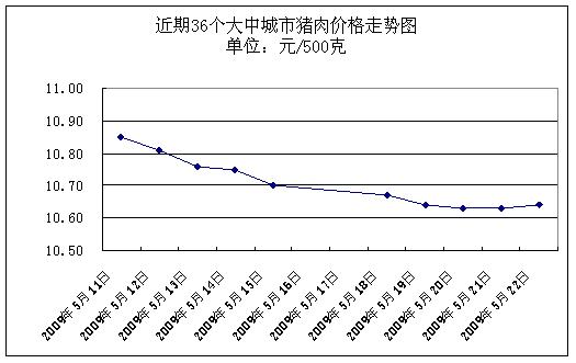 中新网5月25日电 据国家发改委网站消息,据国家发展改革委价格监测中心监测,上周(2009.5.18-2009.5.22,下同)36个大中城市集市、超市猪肉(精瘦肉)平均零售价格每500克为10.64元,与前一周(2009.5.11-2009.5.15,下同)相比下降1.21%。