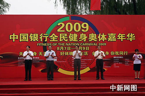 中新网8月7日电 2009年8月7日上午,在全国首个“全民健身日”到来之际,由中国银行独家冠名赞助的“2009全民健身嘉年华”活动开幕式在北京奥体中心举行。