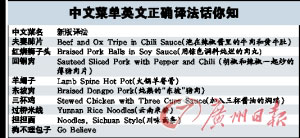 “粤菜早就走出了国门,很多都有固定的译法。”胡总监说,“《中文菜单英文译法》是滞后于现实的,我们早就自我规范过了。”他说,由于粤菜与香港菜系一脉相承,很多粤菜早有习惯的英文译法,一般不会出现不规范的情况,如烧鹅译为“RoastedGoose”,过桥响螺片译为“Conchinhotsoup”,卤水拼盘译为“Pot-stewedMeat”。