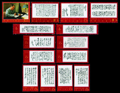 《毛主席诗词》邮票(文7)发行于1967年10月1日,全套14枚,第1枚“毛主席在著作”,图案为毛主席在1961年7月14日摄于杭州汪庄的照片,其他13枚是毛主席的13首诗词手迹。这套邮票有几个特点:一、题材好,开创了“毛主席诗词”题材邮票之先河,展示了世界伟人、开国领袖、诗人、书法家的风采;二、枚数多,全套14枚,在书法、诗词、个人作品之类的题材中,是枚数最多的;三、两种版别、四种规格,较为少见;四、面值低,14枚邮票3种面值(10分、8分、4分),这是当年航空信函、外埠平信、本埠平信3种平常邮资资费。