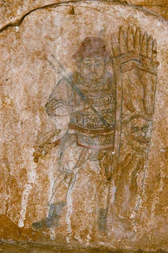 在靠近墓门处的其他浅龛里,绘制的是甲装武士,一类是单纯的执盾执矛的武士,一类是演奏音乐的乐伎。武士在左侧持弓箭、盾、矛枪、短剑等物守卫亡灵;乐伎均为男性武士,鼓乐为主,娱乐亡灵。据胡彬彬教授介绍,乐伎是墓葬壁画中常见的形象,但一般是以女像或常服男像居多,像维山古墓中这种甲装武士乐伎的形象实属少见。