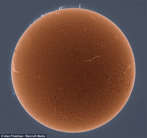 最终,照片以亮丽的色彩呈现出壮观的太阳大气色球层。观者用肉眼清晰可见这颗超级恒星的表面火焰,栩栩如生彷如在跳跃一般;而相当于地球体积数倍大小的太阳黑子,亦清晰地出现在沸腾的等离子区中;而汽化的等离子,可暂时“无视”太阳之引力,再如小瀑布般倾泻而回,在太阳表面形成辉煌的炽热气体弧。