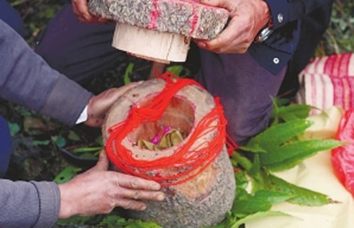 如果上次祭祖以来,家族中有符合入祖资格的死者灵魂片(按僰人的说法,只有年满60岁以上的死者才有资格入祖)就要举行入祖仪式,由族长将“灵魂片”统一放入祖棺,并再次公布灵魂片的具体数目,供下次祭祖时核实。最后用新的白色麻布包裹好灵魂片放入祖棺内,由族长独自抱着祖棺另外选择洞穴秘密安放。