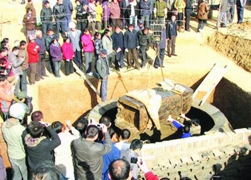 昨日,六安经济开发区宋墓内三具古棺逐一起吊,运往该市人民路上的皖西博物馆进行防腐处理。