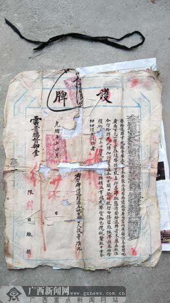 (通讯员 蒙成干 文/图)近日,一张于清代光绪十年由时任兵部尚书兼云贵总督岑毓英部堂颁发的“通行证”在宾阳发现。