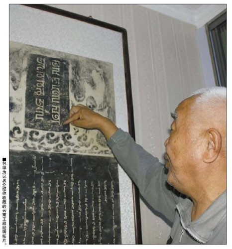 包祥为记者介绍他收藏的云南王藏经碑拓片