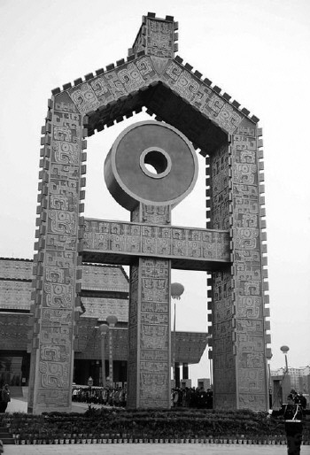 通向展馆的主干道两旁,是由28片极具代表性的青铜甲骨片仿制品组成的碑林,隐含了殷商时期最具代表性的两种元素——甲骨文和青铜器。
