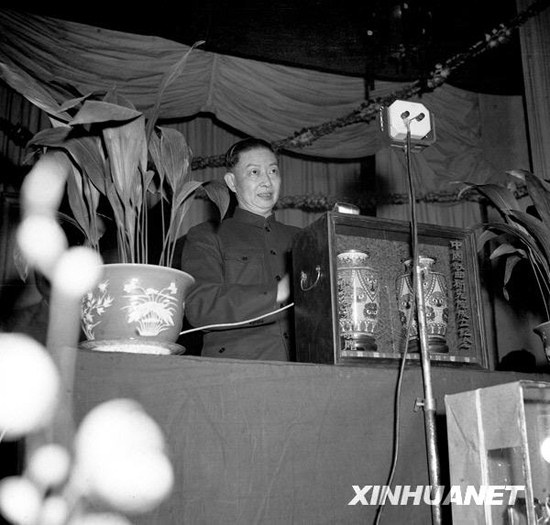 1950年4月3日,中国戏曲研究院在北京成立。梅兰芳任院长。毛泽东主席为中国戏曲研究院成立题词:“百花齐放,推陈出新”。这是梅兰芳在中国戏曲研究院成立大会上讲话(资料照片)。新华社发