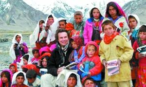 图为葛瑞格·摩顿森在阿富汗和孩子们在一起。
