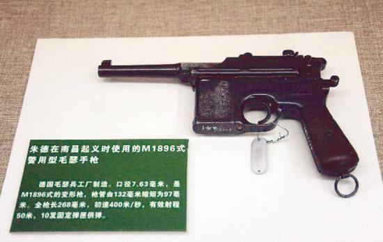 展览中还有一支枪很有历史价值,被称为“中国革命第一枪”——朱德在南昌起义时使用的M1896式警用型毛瑟手枪(国家一级文物)。该枪由德国毛瑟兵工厂制造,枪长268毫米,有效射程50米,10发固定弹匣供弹。朱德就是拿着这支手枪,与周恩来、贺龙等人领导了著名的“八一”南昌起义,创建了人民军队。此后,朱德又带着这支手枪转战南北,并在手枪弹匣一侧刻下了“南昌暴动纪念 朱德自用”的字样。1958年,为迎接国庆10周年,中央军委决定筹建军博时,朱德的毛瑟手枪办理了移交,作为伟大的见证,成为军博的“镇馆之宝”。