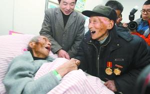 龙年新春正月十一(2月2日)下午三点半,浙江省台州市博爱医院512病房里,两双苍老的手紧紧握在了一起。躺在病床上的老人是93岁的叶万火,已经被确诊为胃癌晚期,将近生命尽头。床前,紧紧拉住他的老人同样年过九旬,这位看起来精神矍铄的老人名叫吴荣凯,刚刚从湖南常德千里迢迢赶来,为的就是见老战友一面。