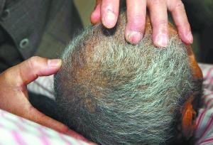 ▲叶老儿子轻抚父亲的头说:“这里面有两块弹片、那边一条是鬼子刺刀留下的。”