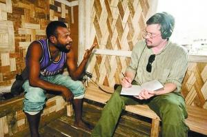 语言学家安德森(右)在巴布亚新几内亚采访当地人。