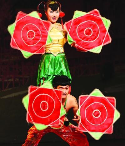 2012年2月4日,赵本山家乡艺术团“东北二人转大型综艺晚会”在南通举行。图为艺术团演员在表演手帕绝活。黄哲/CFP