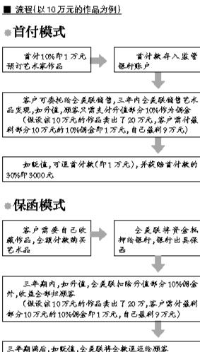 全美联相关负责人指出,全美联将销售现阶段全国最高学术和投资价值的500位知名艺术家的作品,公众可以通过“首付模式”和“保函模式”这两种模式进行艺术品投资和收藏。其中,全美联推出的“首付模式”指的是客户首付10%即可预订名家作品,届时资金由银行监管,如贬值可全额退还首付款。而“保函模式”则是指当顾客全额付款时,全美联将资产抵押给银行做担保,银行为顾客开具保函,3年内,如贬值可全额退款,升值收益归顾客所有。
