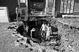 石景山区也是“7·21”特大自然灾害的重灾区之一,部分文物古建出现不同程度损伤。全国重点文物保护单位承恩寺的一进院内,因为雨大水急,排水管道出现阻塞,结果大水在寺院门前冲出一个大坑。大坑直径5米,深约5米。险情发生后,工作人员立即疏通下水道,随后对暴雨冲出的大坑进行回填。目前回填工作已经完成,下一步将对排水系统进行全面检查,寺院门前还要进一步整修。