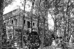 沿着小路上山,首先看到一座三层碉楼“据守”在山脚下。碉楼由花岗岩砌成,四周遍布瞭望孔和射击孔,外形与北京植物园内复建的碉楼极为相似。碉楼的台阶已被铁门封住,记者隔着窗户向里面望去,只见有木质楼梯可以上楼,只是楼梯有多处朽烂。记者了解到,由于当年社会动荡,一些大户人家都会在住宅外修建碉楼,以防匪患。同行的保安告诉记者,他在园内工作一年有余,在此期间还未看到有人进过碉楼。