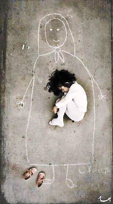 这名孤儿院的孩子 ,因为从未见过妈妈,她就在地板上画了一个妈妈,想像着,在妈妈温暖的怀里睡着了。