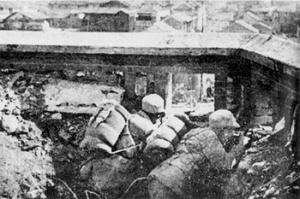 第三次长沙会战中,伏在长沙天心阁城墙上英勇打击日军的中国士兵。