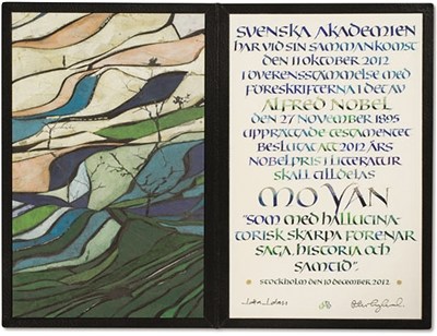 每届诺奖得主的获奖证书都有专人设计,今年为莫言设计的是瑞典画家、雕塑家约翰·斯滕堡(John Stenborg),约翰出生于1957年,风格抽象、前卫,2011年他被选入皇家艺术学院。