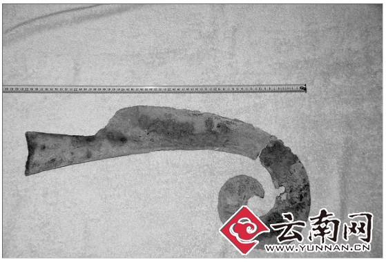 这把长约60厘米,器物形状较为硕大的人面纹饰弯刀属首次发现。