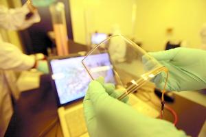 在中科院重庆研究院微纳制造与系统集成研究中心实验室里,记者看到了这款神奇的触摸屏。与现有的触摸屏相比,它透光率更高、功耗更低、性能更稳定,而且更轻更薄。中心副主任史浩飞介绍,石墨烯是一种由碳原子构成的单层片状结构的新材料,也是目前世界上最薄、最坚硬的纳米材料。它几乎是完全透明的,可以用来制造透明触控屏幕,还可以制造光板、甚至是太阳能电池。