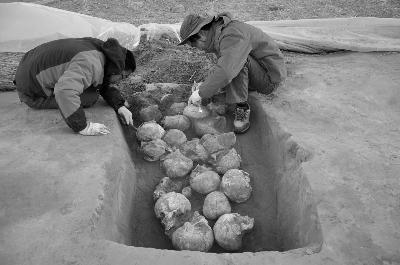 考古工作人员在遗址现场清理人头骨