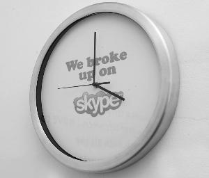 1.展厅里挂着一个画有SKYPE标识的时钟,它的捐赠者把指针定格在4点,并写有“分手在SKYPE”的字样。她这样讲述自己的故事:“我们以电邮、电话、SKYPE等多种方式交流,但最终还是在SKYPE上分了手。”