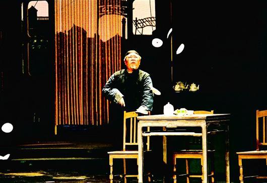 深深一个鞠躬,王利发送走了裕泰茶馆最后一个客人常四爷。黯然回头的他一张张捡起洒落在桌面上的纸钱,一丝苦笑之后扬手将它撒了出去。似乎是有些犹豫,却又在最后一刻下了狠心,他一把抓起搭在椅背上的腰带,踉踉跄跄地走出了观众的视线……