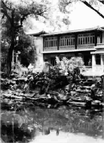 湖水环抱的大草坪前,就是宋庆龄曾居住的二层仿古主楼。主楼与王府建筑联成一体。原正房畅襟斋是载沣晚年居所,匾额为翁同龢所题。宋庆龄把那里作为大餐厅,用于举办正式宴会,畅襟斋的前厅用作大客厅。