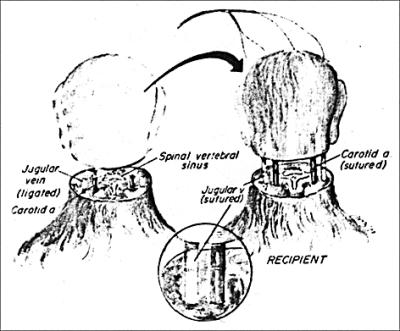 1954年,尽管前苏联卫生部门下达了禁令,但前苏联科学家弗拉基米尔·P·德米科霍夫还是进行了他的极富争议性的手术。在莫斯科郊外的一个实验室里,他将一只小狗的头、肩膀和前腿移植到了一只成年德国牧羊犬的脖子上。德米科霍夫向来自世界各地的记者展示了他的这一得意“作品”:怪物狗的两个头都能呼吸、活动,并能同时舔食碗里的牛奶;有趣的是,第二个头总想去咬第一个的耳朵。