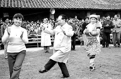 1986年2月7日,胡耀邦在云南省罗平县板桥区长底乡参加当地苗、布依、彝、汉族群众举行的春节联欢会,并高兴地和各族群众一起跳起欢乐的民族大团结舞。(资料图)