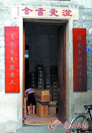 东漖石街坊12号,是一栋青砖大屋,石门上方门额上写着“澄爱书舍”四个朱红大字。石门两侧红漆木板上刻着一副对联:“书舍崇文启后人,澄爱求同兴伟业”。大门被锁上了,村民郭宾(化名)说,现在屋子成了工厂仓库。