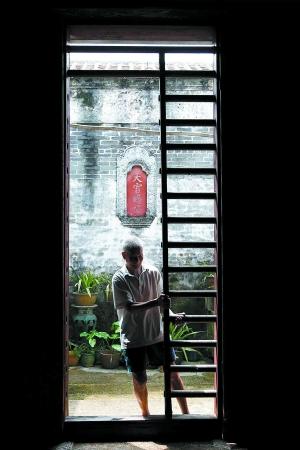 79岁的郭子泰拉动自家的趟栊门,东漖村内有很多上百年历史的古老大屋。