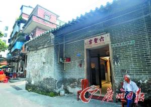 在广州众多乡间神庙中,位于中山大学西侧新凤凰直街内的“六圣宫”可谓十分独特的一座建筑。六圣宫是清代建筑,三间两进,建筑占地面积约150平方米,大门门额石刻显示重修于嘉庆壬申年(1812年)。村中老人黄伯说,六圣宫宫内原本供奉6尊神像,分别有文昌帝君、南海广利洪圣大王、北方真武玄天上帝、大慈大悲观世音菩萨、天后娘娘及六祖真人,因此得名“六圣”,在广州可算独一无二。