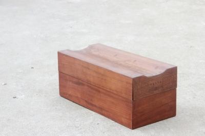 夏磊是扬州精细木作技艺传人,在他的工作室里,制作完好的一书厢一书匣仔细归放着。两件成品古朴典雅,庄重大方,墩实却显灵趣。据夏磊介绍,这两件作品均为楠木材质,纯手工榫卯制作而成,其中书厢长约50cm、宽35cm、高40cm,为框架结构,牢固美观,轻启两扇小门,木质清香扑面而来。