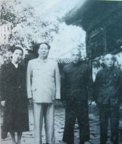 照片摄于1951年的5月,毛泽东的两位表兄文运昌与文涧泉在北京住了些日子。两位表兄对毛泽东说,住也住了,该去看的地方也去看了,连机场的飞机都看了,想跟你合一张照拿回去给老乡看看,证明我到了你这里,行么?毛泽东笑道:“不照相就表示你没在毛泽东家里住过么?” 毛泽东立即叫来了江青,说:“表兄们说住也住了,看也看了,说还要有照片为证哩。我一个人恐怕还证明不了,还得你这个居家的堂客(湖南土话,指妻子)在场才行哩!” 江青立即走了过来,准备合影。到了相机跟前,江青又往里间跑,穿上了她那一身自己很喜欢的外套。 于是留下了这张合影。(资料图)