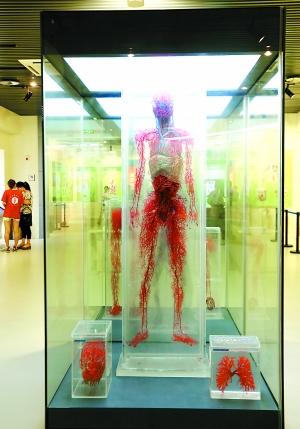 在这个由全身血管组成的人体内,只见红色的大小血管像杂乱而又有秩序的树根一样。讲解员介绍,这个标本由遗体捐献者的遗体制作而成,制作人员先把一种塑化剂打入血管,让血管固化,然后再“洗去”组织、肌肉等,再将动脉血管染成红色,静脉血管染成蓝色,就成了眼前这个“红人”人体血管标本。
