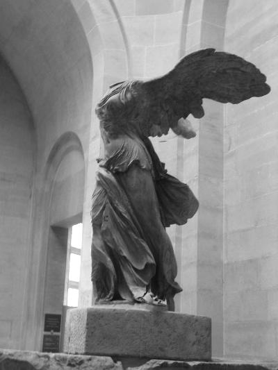 《胜利女神》是一件巨型大理石雕塑作品,高5.57米,重32吨。雕塑表现的是希腊神话中的胜利女神。她伸展着双翼,高高站立在船头上,在海风吹拂下,翅膀的羽毛微微颤动,柔软的裙裾贴在身体上并向身后飘扬。雕塑的头部和双臂早已遗失。根据希腊出土的钱币上的图案推测,胜利女神应该手持长号,正在吹响胜利的号角,传播胜利的消息。雕塑制作于公元前2世纪初的希腊化时期,是人们为了纪念一次海战胜利,在萨摩色雷斯岛的胜利女神庙内竖立起来的。卢浮宫《胜利女神》是希腊化时期的雕塑精品原件。女神部分以珍贵的希腊白色帕罗斯大理石雕成,巨型船头采用带有白色纹理的灰色大理石,以与人物雕像造成反差,两部分搭配颇具匠心。