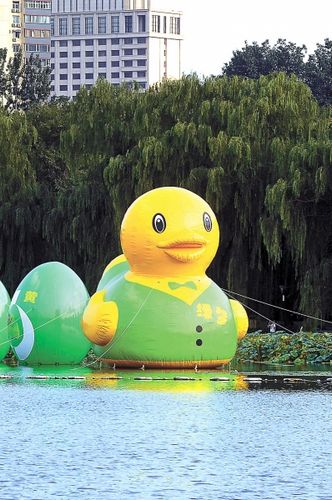 而就在正版大黄鸭在北京园博园亮相的前一天,一只10米高、身穿绿马甲的“大绿鸭”也出现在玉渊潭公园的水面上,引来众多市民围观。和正版大黄鸭不同的是,这只鸭子身后还有7个它下的绿色的蛋。