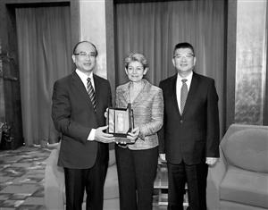 许勤向博科娃赠送纪念品。深圳报业集团记者 许业周 摄