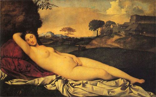 1510年,威尼斯画派名家乔尔乔内做了《沉睡的维纳斯》,是为威尼斯史上第一幅有名的正面全裸女体画;可惜他英年早逝,33岁就归了天,同样师出贝里尼门下的师弟,威尼斯画派大宗师提香,帮着补完了此画的天空与景物部分,顺便化用了此裸女造型,28年后,融进了自己《乌尔比诺的维纳斯》里,用来应付乌尔比诺爵爷的委托约稿——当然,在那时,这画也只供乌尔比诺爵爷私藏,没公开展过。到1651年,西班牙大宗师委拉斯凯兹画完了《镜前的维纳斯》,只是裸了个背,姑娘的面容模糊在镜中。饶是尺度如此严谨,到委大师过世,这画也没能跟普罗百姓见面——一半是因为委大师是宫廷画家,等闲凡人见不着;一半是西班牙天主教势力极强大,凡人画这个就犯法。